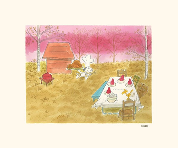 Created from key concept art by Dean Spille, this artwork captures Snoopy and Woodstock enjoying a heartfelt feast, celebrating friendship, fun, and the simple joys of life. A Charlie Brown Thanksgiving, the tenth prime-time special based on Charles M. Schulz’s beloved comic strip, remains a cherished holiday classic, known for its humor, warmth, and message of gratitude. Every detail of this artwork embodies the charm and whimsy that have made Peanuts an enduring part of animation history.