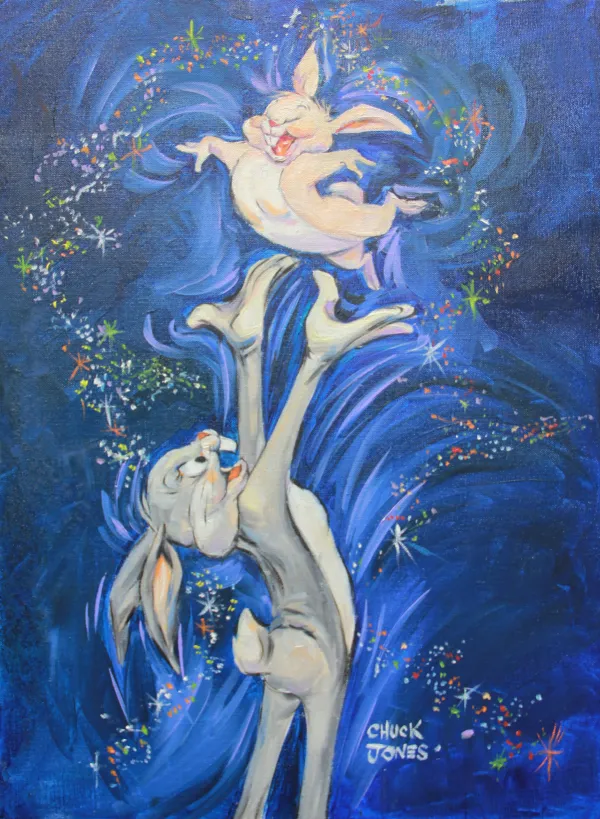 The inspiration for this work of art came from an original work by Chuck Jones featuring the Looney Tunes character, Bugs Bunny with Baby Bunny.