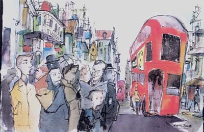 Chuck Jones loved to sketch, draw, and paint when he traveled; he rarely left home without his cloth bag of art supplies. "Bus Queue London" is such a work. Drawn and painted while visiting London in 1960, this spectacular character study epitomizes his artistic techniques and his astounding observational skills.
