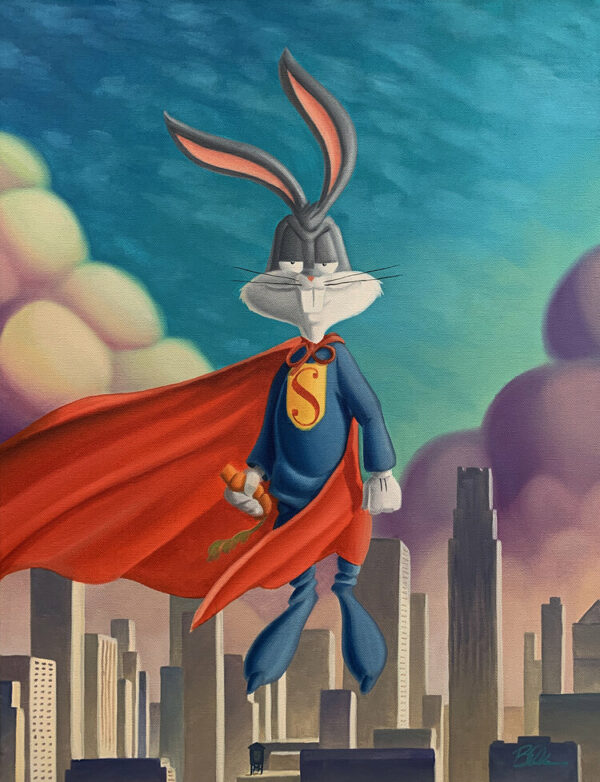 The inspiration for this work of art came from an original work by Ben Olson. The work is based on the 1943 Chuck Jones-directed animated short, Super Rabbit starring Bugs Bunny. This looks like a job for a *real* superman!