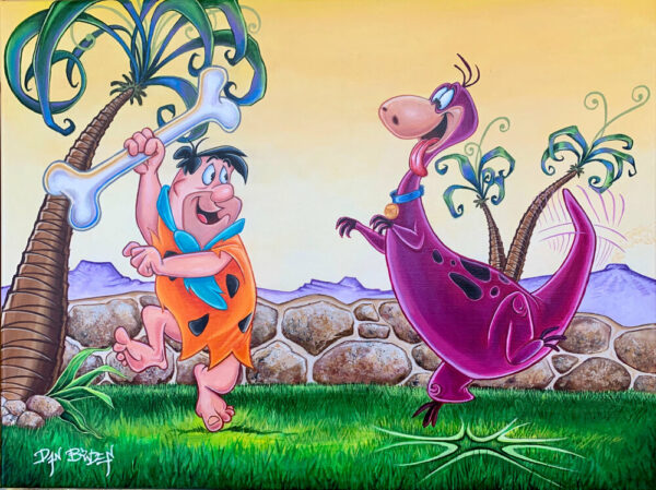 The inspiration for this work of art came from the popular television animated series, The Flintstones. The Flintstones has some legendary American cartoon characters. Over the years they have inspired millions. Dan Bowden's take on "Fetch This Dino" is very 'fetching' and will look great on your wall.