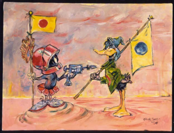 The inspiration for this work of art came from an original oil painting by Chuck Jones. The work features the Loney Tunes characters, Marvin Martian and Daffy Duck from the 1953 animated short, Duck Dodgers in the 24 1/2 Century. Look, bud, I've got news for you. I have already claimed this bit of dirt for the Earth, and there just ain't room enough on this planet for the two of us.