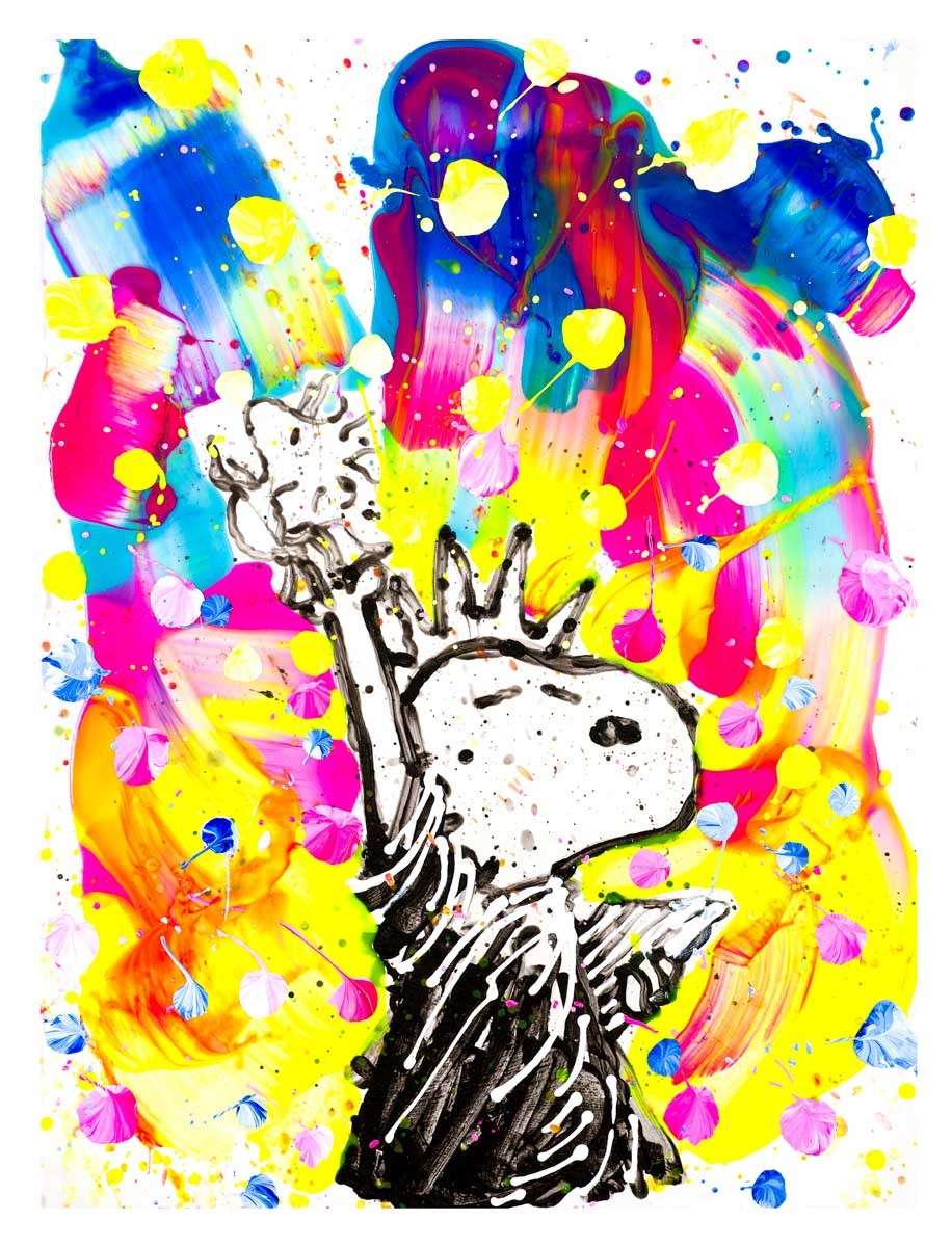 “Free Bird” is inspired by Snoopy and Woodstock, reimagining a classic PEANUTS moment to capture the feeling of newly found freedom after years of absence. The composition is based on an actual Schulz strip drawing, originally showing Snoopy as the Statue of Liberty holding a football—Everhart replaced the football with Woodstock, soaring freely into life. Everhart transforms this scene with his signature color, texture, and expressive style.