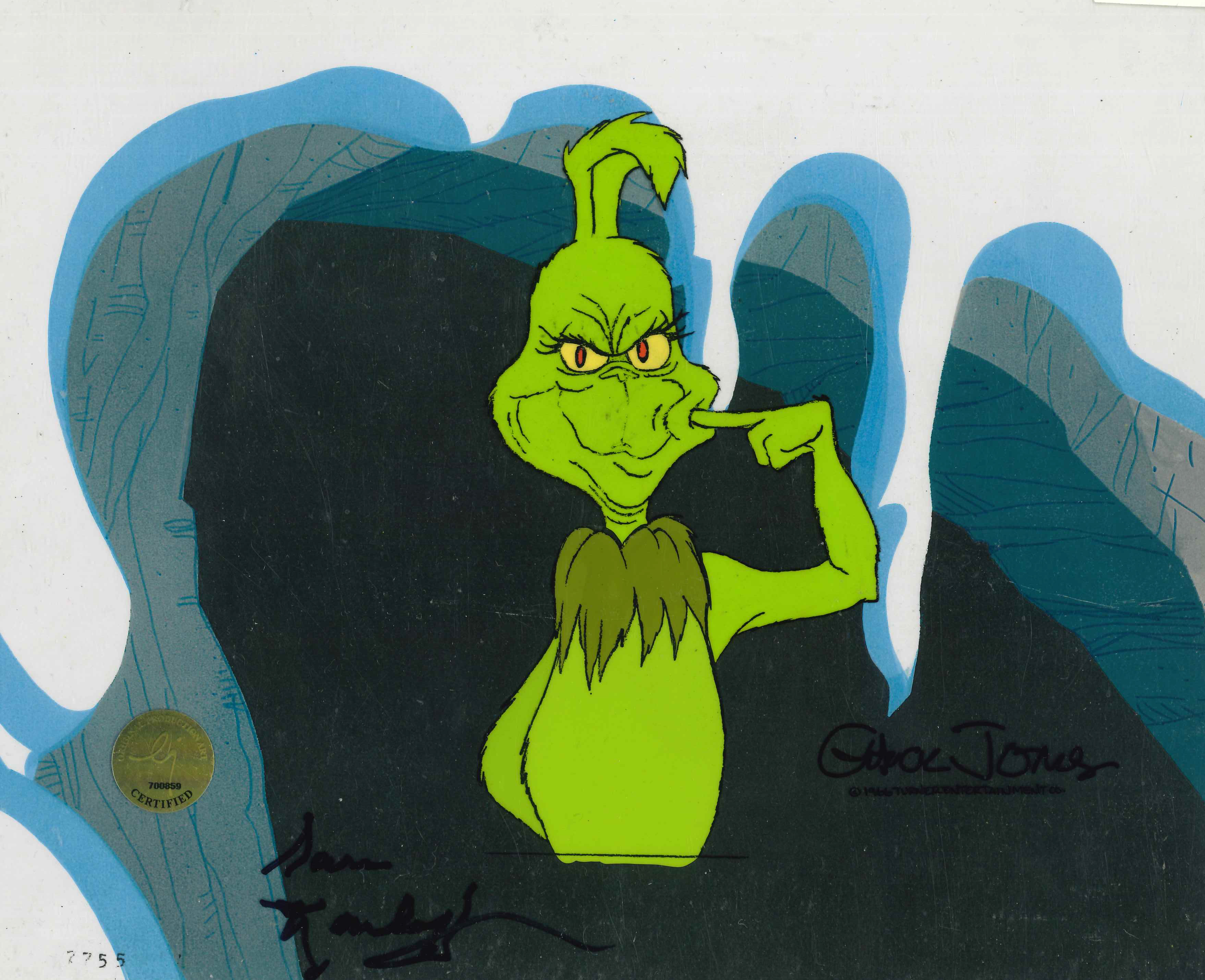 This original production cel comes from Chuck Jones’s extensive archive of original and limited-edition works. Created for the 1966 television special and adapted from Dr. Seuss’s 1957 book, this artwork captures one of the Grinch’s most humorous and memorable expressions.