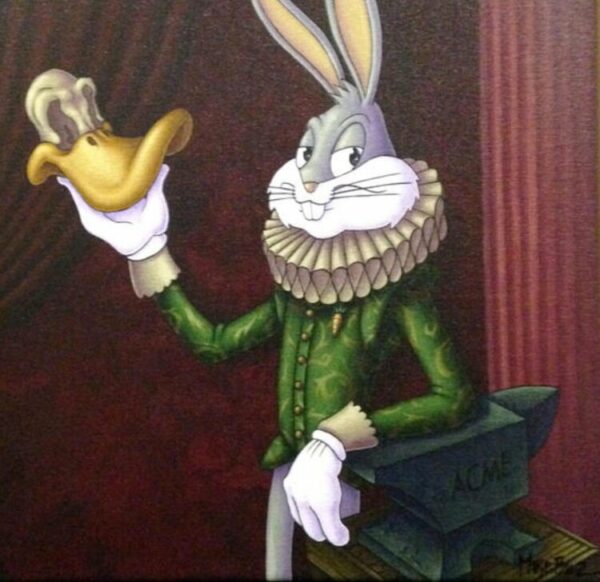 The inspiration for this work of art came from an orignial work by Mike Bilz featuring the iconic Looney Tunes character, Bugs Bunny in Shakspearean-style holding the skull of Daffy Duck
