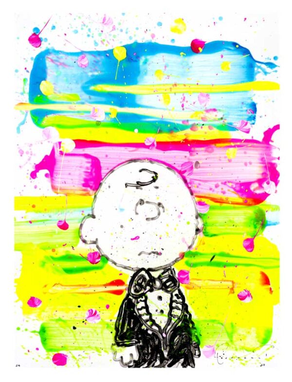 Homecoming King is inspired by Charlie Brown, a PEANUTS character reigning as 'homecoming king' in a tux. This Limited Edition work is part of Everhart’s Working On My Brand collection, an ongoing series of releases leading up to the 75th anniversary of Charles Schulz’s PEANUTS®, introducing additional characters—reimagining classic PEANUTS moments with Everhart’s signature color, texture, and expressive style.