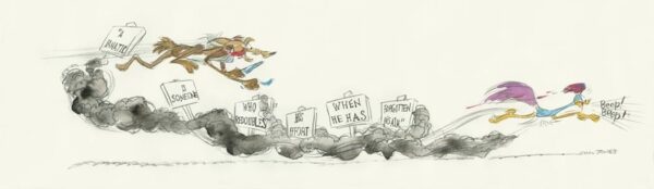 Inspired by American philosopher George Santayana’s quote, “A fanatic is someone who redoubles his effort when he has forgotten his aim,” the artwork humorously captures Wile E. Coyote’s relentless—and often misguided—pursuit of the Road Runner. Evoking the charm of mid-20th-century Americana, including the beloved Burma Shave highway signs, this artwork blends wit, history, and animation mastery.