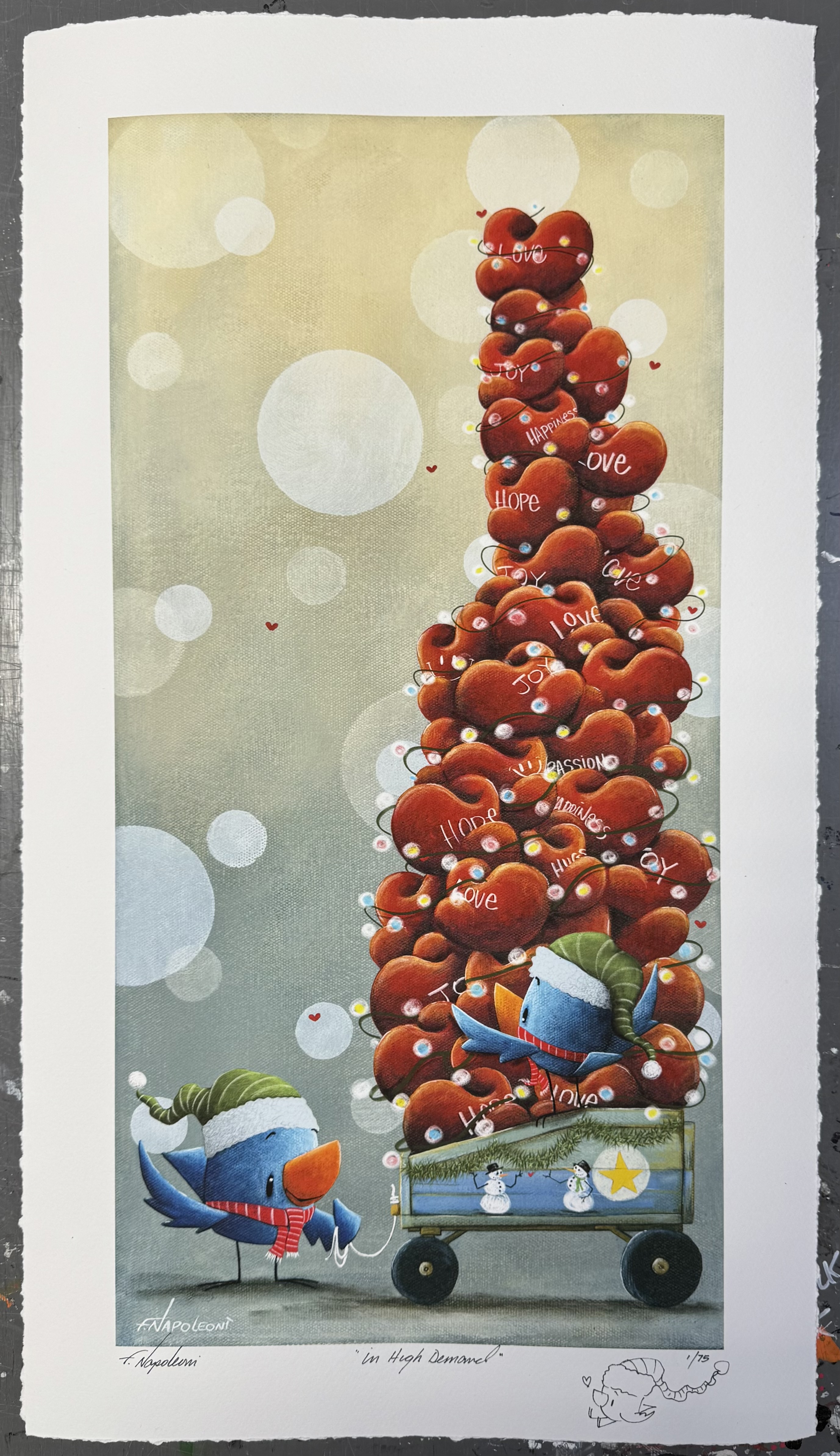 In this holiday-themed limited edition, Napoleoni’s beloved character Blu is depicted pulling a red wagon overflowing with bright red hearts stacked like a Christmas tree, symbolizing generosity, love, and the spirit of the season. The whimsical composition, playful details, and festive palette make this piece a standout collectible for fans of Napoleoni’s work and holiday fine art alike.