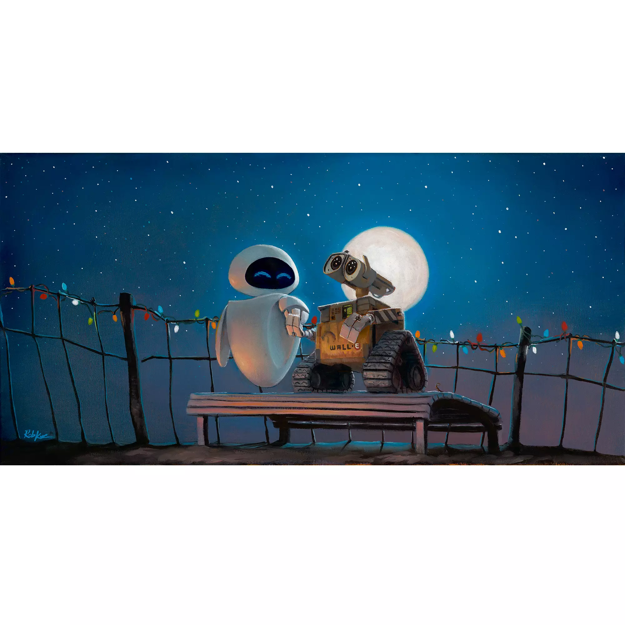 In “It Only Takes a Moment,” Kaz captures the tender interaction between WALL-E and EVE from Disney/Pixar’s 2008 animated feature film WALL-E. The artwork emphasizes the sweet, quiet moment of connection between the two beloved characters, highlighting themes of love, hope, and discovery, all set within Kaz’s luminous, whimsical style.