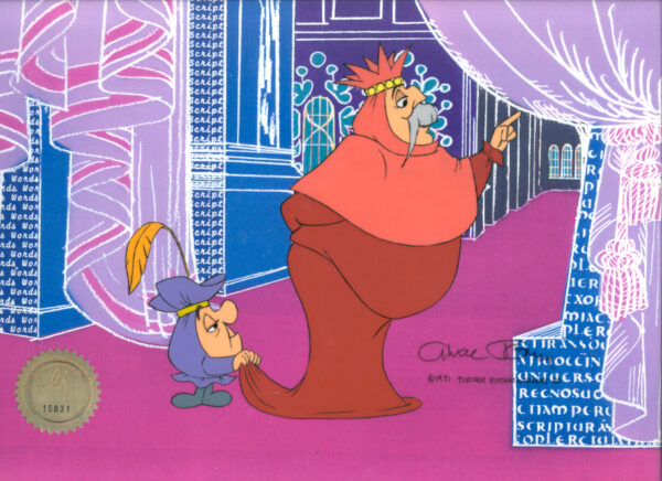 The inspiration for these original works of art came from the 1970 Chuck Jones-directed animated film 'Phantom Tollbooth,' based on Norton Juster's 1961 children's book of the same name. This original production cel features the characters, King Azaz and Little Minister.