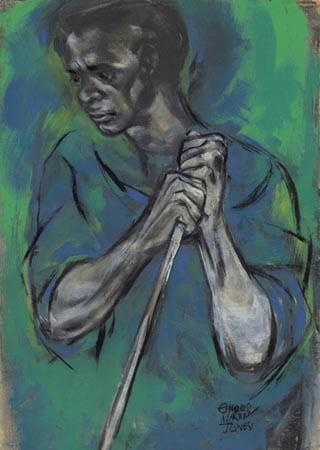This exquisite life drawing of a man holding a staff represents Jones's facile ability with chalk and charcoal; rendering his subject with sensitivity, grace, and power--he shows the subject tremendous respect.