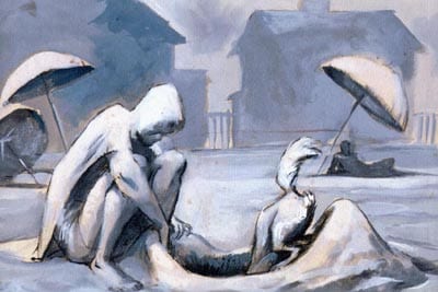 The inspiration for this work of art came from an original work by Chuck Jones based on his time at Manhattan Beach. Between houses in the early 1940s, Chuck Jones, his wife Dorothy, and their young daughter, Linda, lived with Chuck's mother in Manhattan Beach, California for a bit (that's Mabel's house to the right in the background.) Jones, classically trained as an artist, puts that time to good use in Manhattan Beach and yet brings his sense of humor to it as well.