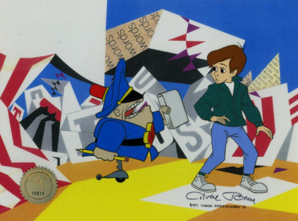 The inspiration for these original works of art came from the 1970 Chuck Jones-directed animated film 'Phantom Tollbooth,' based on Norton Juster's 1961 children's book of the same name. This original production cel features the characters, Milo and Officer Short Shrift.