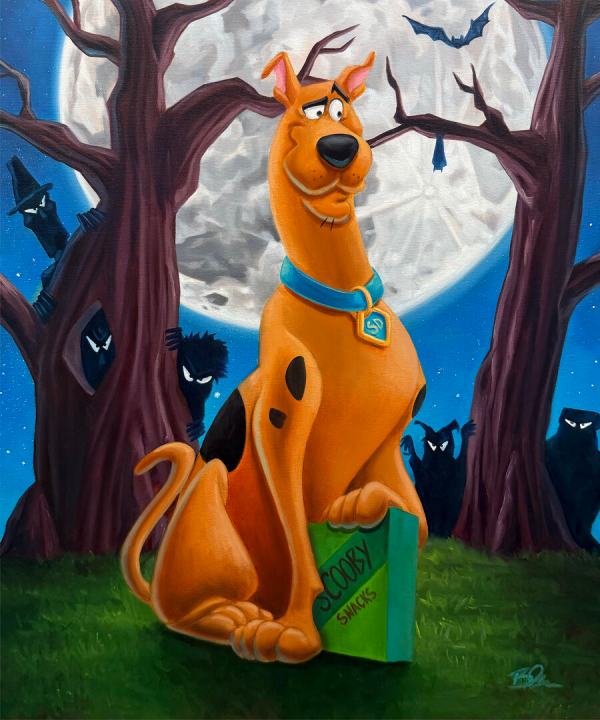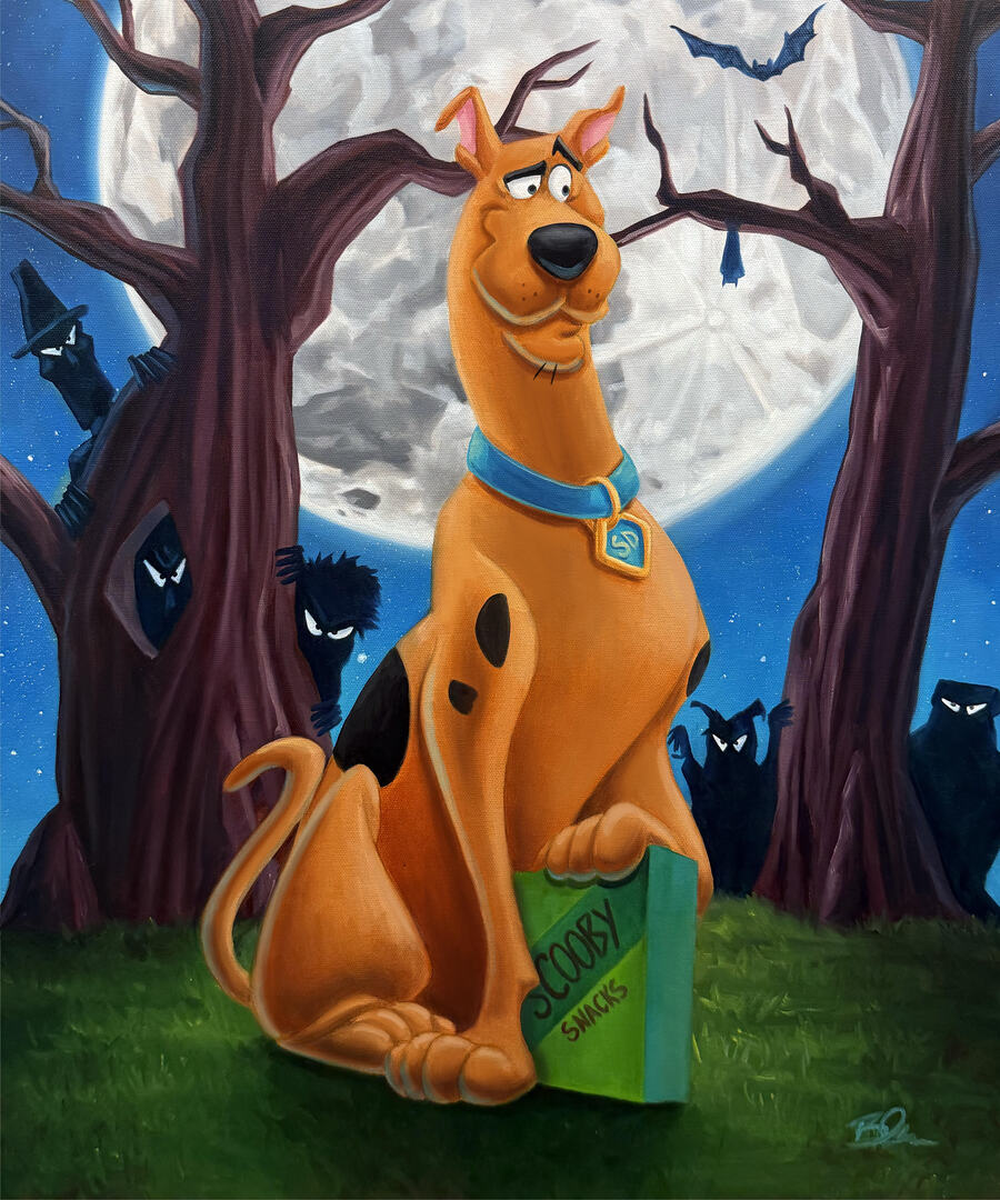 I’ve been wanting to create a solo Scooby piece all year, and kicking off Halloween felt perfect. What’s Scooby more afraid of—the monsters, the spooky night… or someone stealing his snacks? That full moon rising off the coast is something I see often, and painting it as it appears in the cartoons was a real treat."—Ben Olson