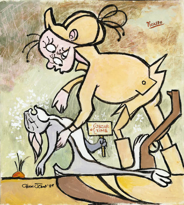 The inspiration for this work of art came from an original oil painting by Chuck Jones. Oscar Season is based on the artist, Pablo Picasso's "death scene" featuring Bugs Bunny and Elmer Fudd.