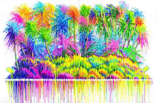 Paper Doll (Tahitian Landscape) is inspired by the breathtaking vistas visible from Everhart’s Tahitian studio, reflecting his exploration of landscapes after dedicating thirty-five years to Schulz-inspired themes.