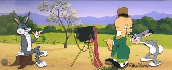 The inspiration for this work of art came from a drawing created by Chuck Jones based on the 1944 animated short,'Elmer's Candid Camera' featuring Bugs Bunny and Elmer Fudd.