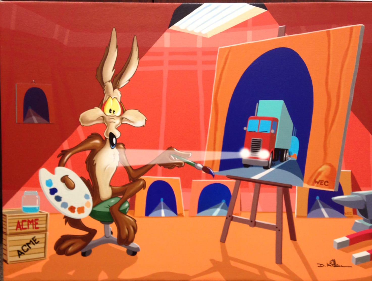 The inspiration for this work of art came from an original work by Daniel Killen featuring the cartoon character, Wile E. Coyote painting a semi-truck whose lights are shining off the paper onto his chest.