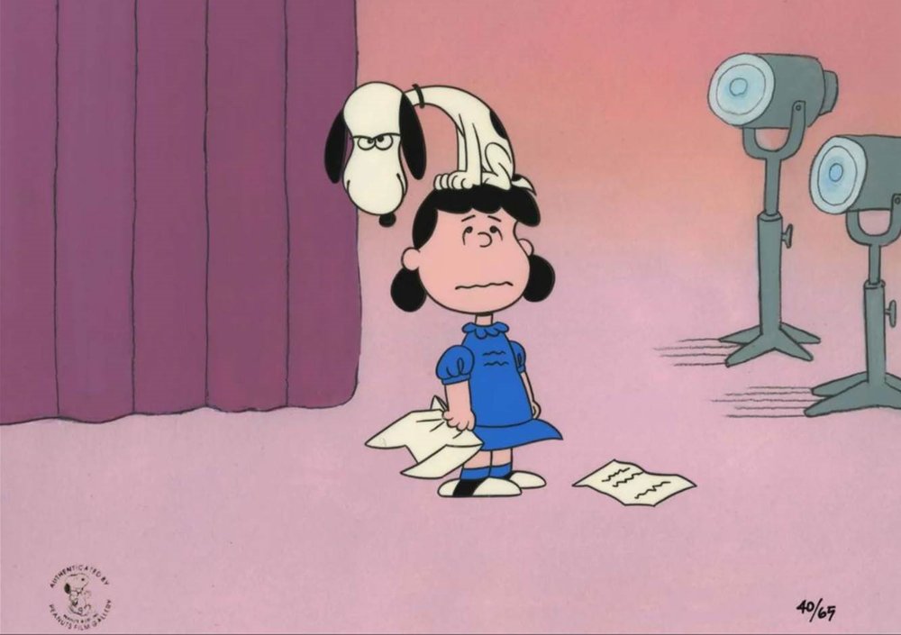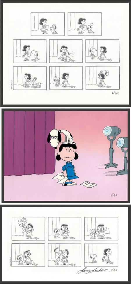 This work was created from the 1965 animated special,  A Charlie Brown Christmas, featuring Lucy and Snoopy accompanied by a diptych giclee print of a storyboard created by Larry Leichliter for this art.
