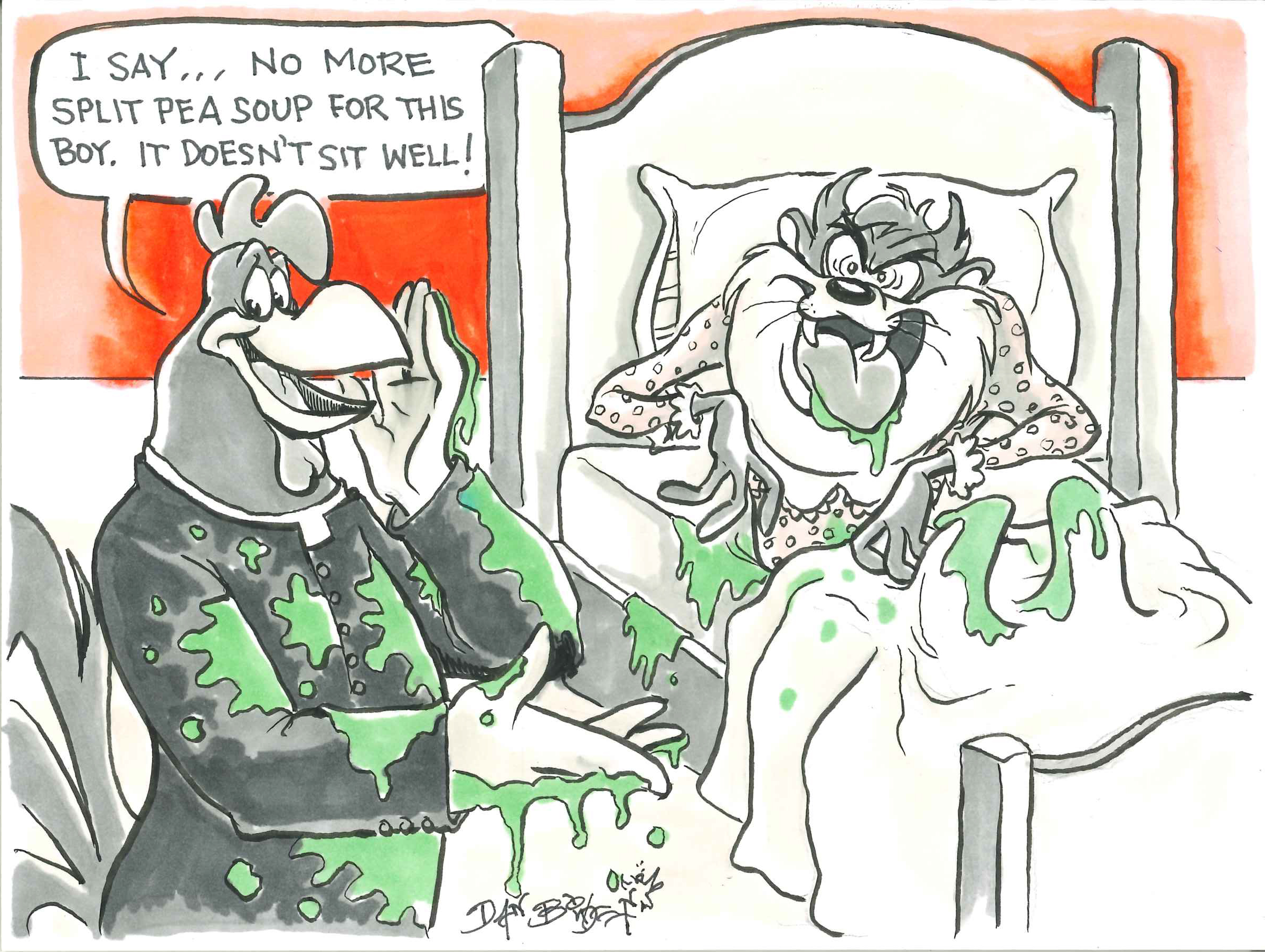The inspiration for this work of art came from an original by Dan Bowden based on the 2023 Inktober prompt 'The Exorcist' featuring the Looney Tunes characters Foghorn Leghorn and Tasmanian 'Taz' Devil.