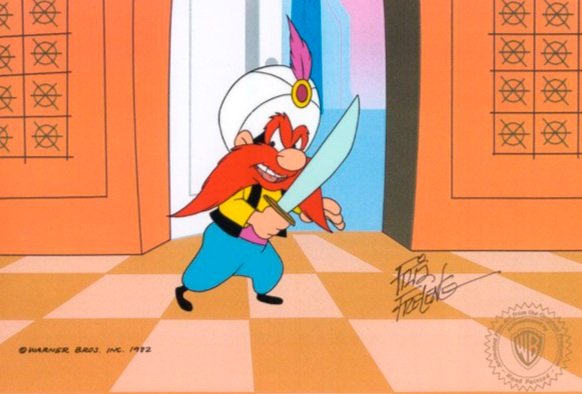 The Official Chuck Jones Virtual Experience is pleased to offer LOONEY TUNES fans a "Yosemite Sam With Sword" Original Production Cel artwork by Friz Freleng.
